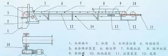 此外該刮板還可清理滾筒上黏結的物料,并在刮刀下方設置有接料槽,使物料可以落到槽內,每隔一段時間對滾筒進行清理,以保證滾筒的平整,防止輸送帶的跑偏。