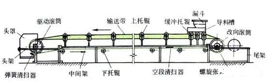 該裝置沿著改向滾筒方向布置,其刮板在制造時選用聚氨酯類材料;且采用平行刮板布置,在刮板上安裝有彈簧,以保證刮板與輸送帶之間存在良好的接觸,同時避免產生過大的壓緊力,對輸送帶造成磨損。