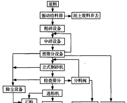 圖1所示為典型的干法生產工藝流程,原料經過振動給料篩和篩分機組合篩除泥土以后,一般要經過粗碎和中碎兩道破碎后再進行檢查篩分,通過篩分將礦石分成3個部分: