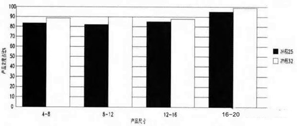 沖程就是圓錐破碎機松邊排放口至緊邊排放口的距離。在現場我們用單缸液壓圓錐破機2種不同沖程,破碎相同的石料,生產出來的石料進行比較。具體數據見圖1。
