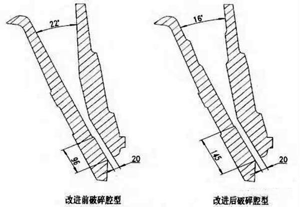 改進后破碎腔嚙角由22°變為16°,嚙角的減小可以夾住較大石料,防止破碎時石料往上跳,這樣破碎腔中石料填充率提高,形成層壓破碎,減少產品石料針片狀含量,優化產品粒度。理論上,如果嚙合角過大,礦石在破碎腔內容易打滑,生產能力降低,同時增加了襯板的磨損和電能消耗;如果嚙合角過小,將導致破碎腔過小,容納的礦石量相對減小,對產量造成影響,同時會增 加設備的制造費用和機器的高度。