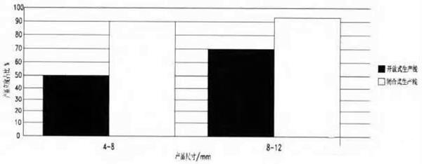 由圖3可得閉合式生產線所生產的產品粒度占比遠遠高于開放式生產線。原因是不合格的返料多次破碎,成品形狀更好,特別是細料產品更突出。